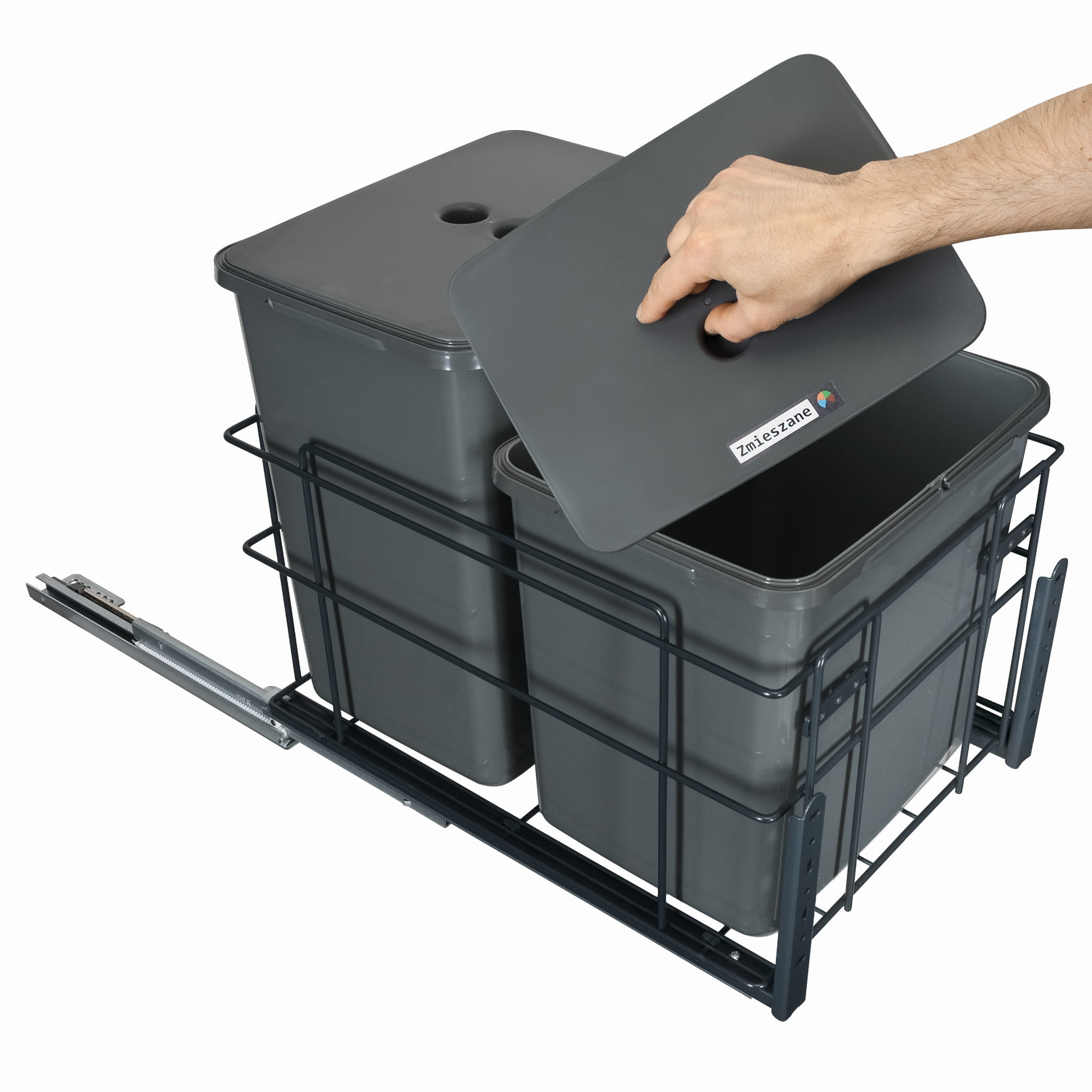Segregator odpadów wykonany jest z trwałych materiałów, takich jak stal malowana proszkowo i wysokiej jakości tworzywo sztuczne. Łączy solidność konstrukcji z estetyką wykonania. Prowadnice dolnego montażu z funkcją pełnego wysuwu i systemem cichego domyku zapewniają płynne i niemal bezgłośne użytkowanie, a ergonomiczne uchwyty i pokrywy w obu pojemnikach ułatwiają codzienne opróżnianie i minimalizują nieprzyjemne zapachy.