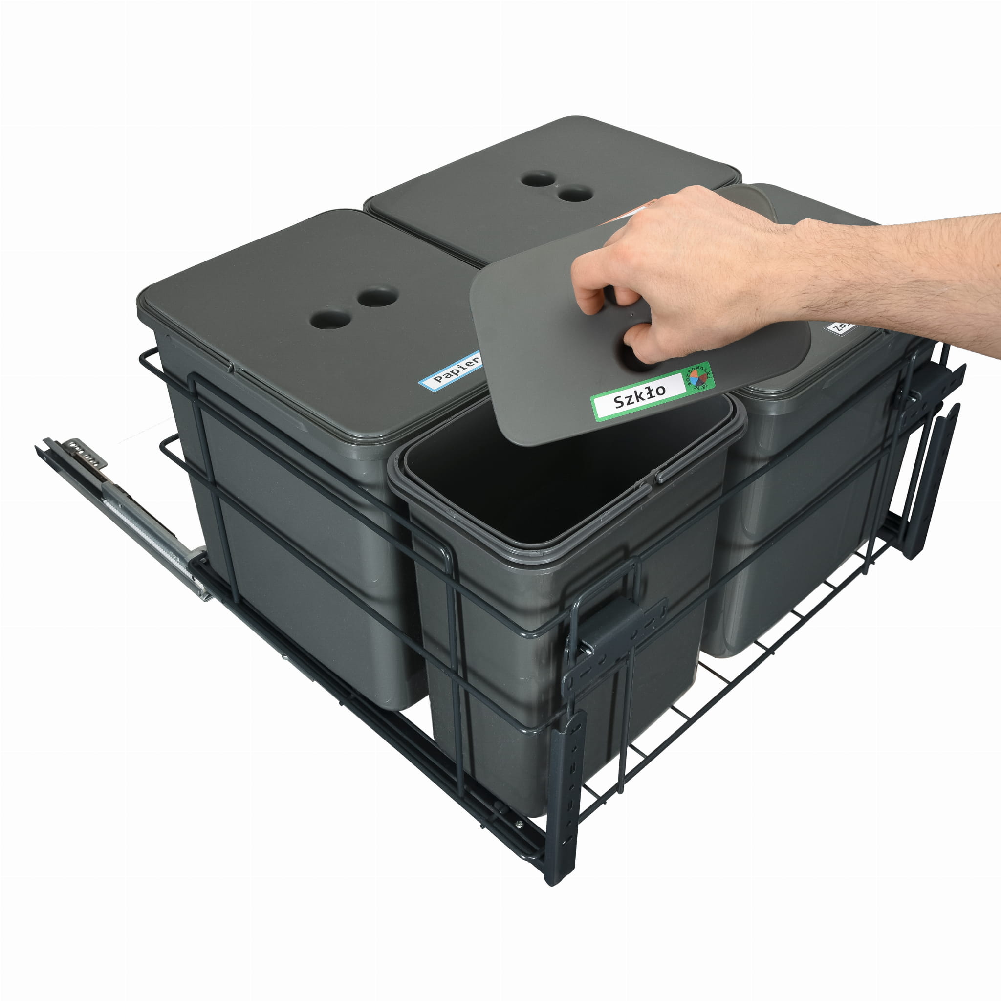- 3 pojemniki na odpady segregowane o pojemności 16 l z uchwytami i pokrywami