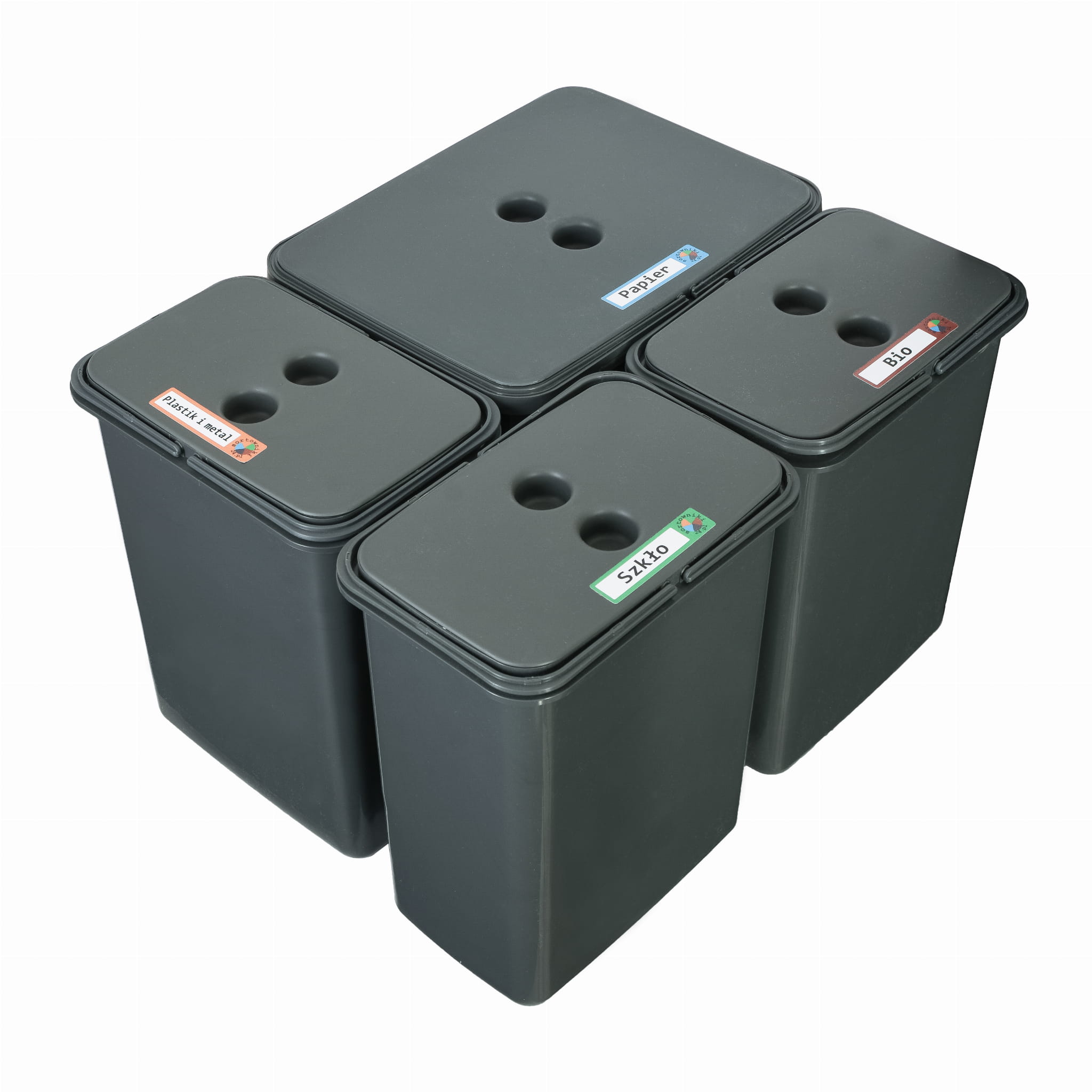 - zestaw 4 pojemników – 1 kosz na śmieci do szuflady o pojemności 16 litrów oraz 3 kosze po 8 litrów każdy, umożliwiające segregację różnych frakcji odpadów