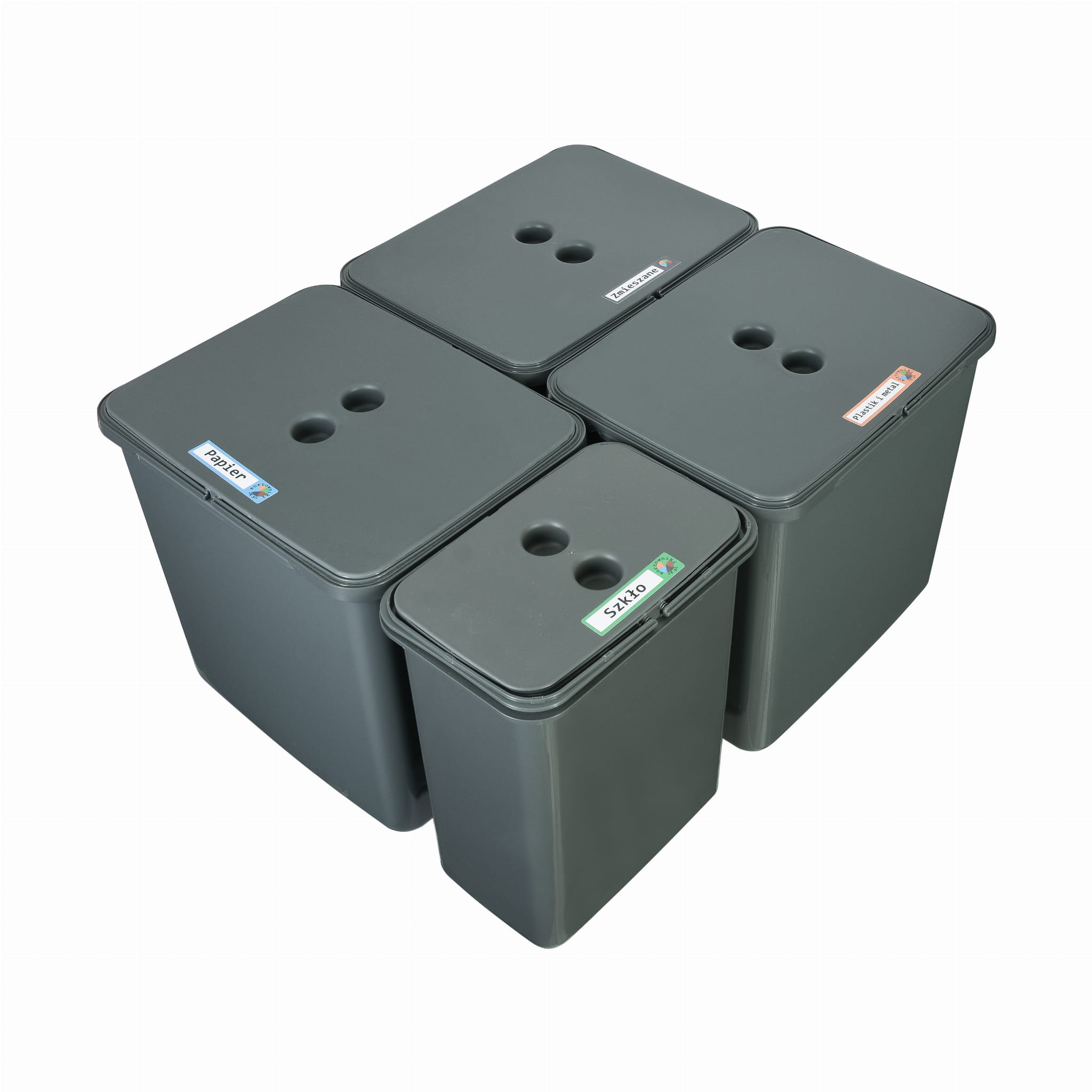 Zestaw składa się z czterech pojemników do segregacji pod zlew: trzech o pojemności 16 litrów oraz jednego małego kosza do segregacji śmieci o pojemności 8 litrów. Dzięki takiemu układowi możliwa jest wygodna i intuicyjna segregacja różnych frakcji odpadów, takich jak bio, zmieszane, plastik, papier czy szkło.