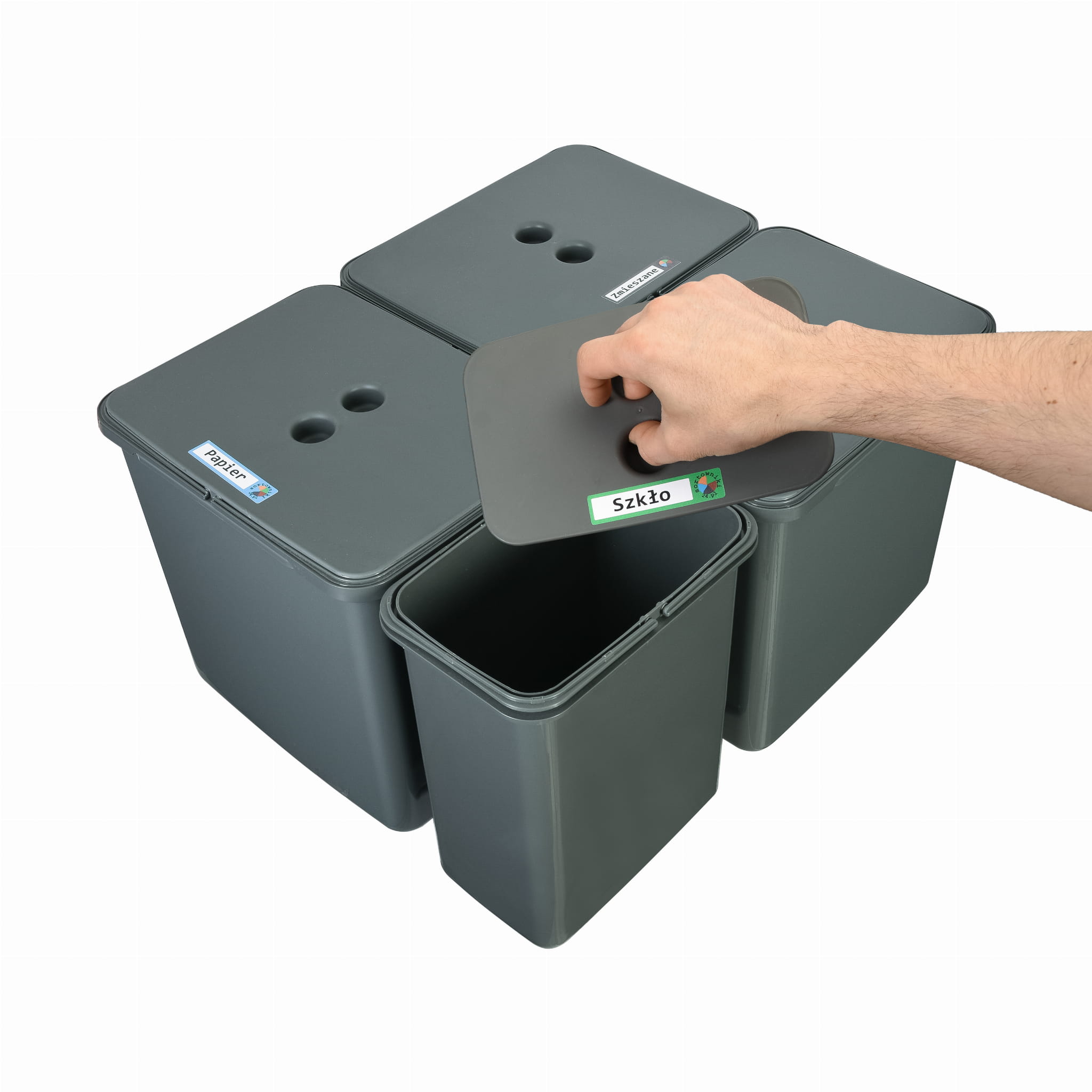 - kompletny zestaw do segregacji odpadów - 3 pojemniki do segregacji pod zlew o pojemności 16 l oraz 1 pojemnik o pojemności 8 l