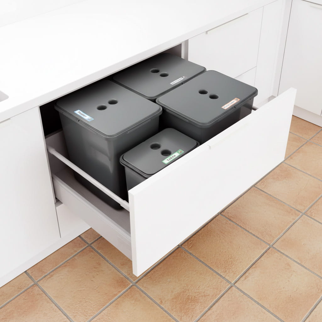 Kosze wykonane są z wysokiej jakości tworzywa odpornego na uszkodzenia i wilgoć, dzięki czemu zestaw jest trwały, bezpieczny w użytkowaniu i łatwy w czyszczeniu. Gładkie ścianki powodują, że mycie pojemników przebiega szybko i bezproblemowo. Stonowana kolorystyka oraz minimalistyczny design sprawiają, że sortownik idealnie komponuje się z nowoczesną zabudową kuchenną i pasuje do większości systemów szuflad renomowanych producentów.